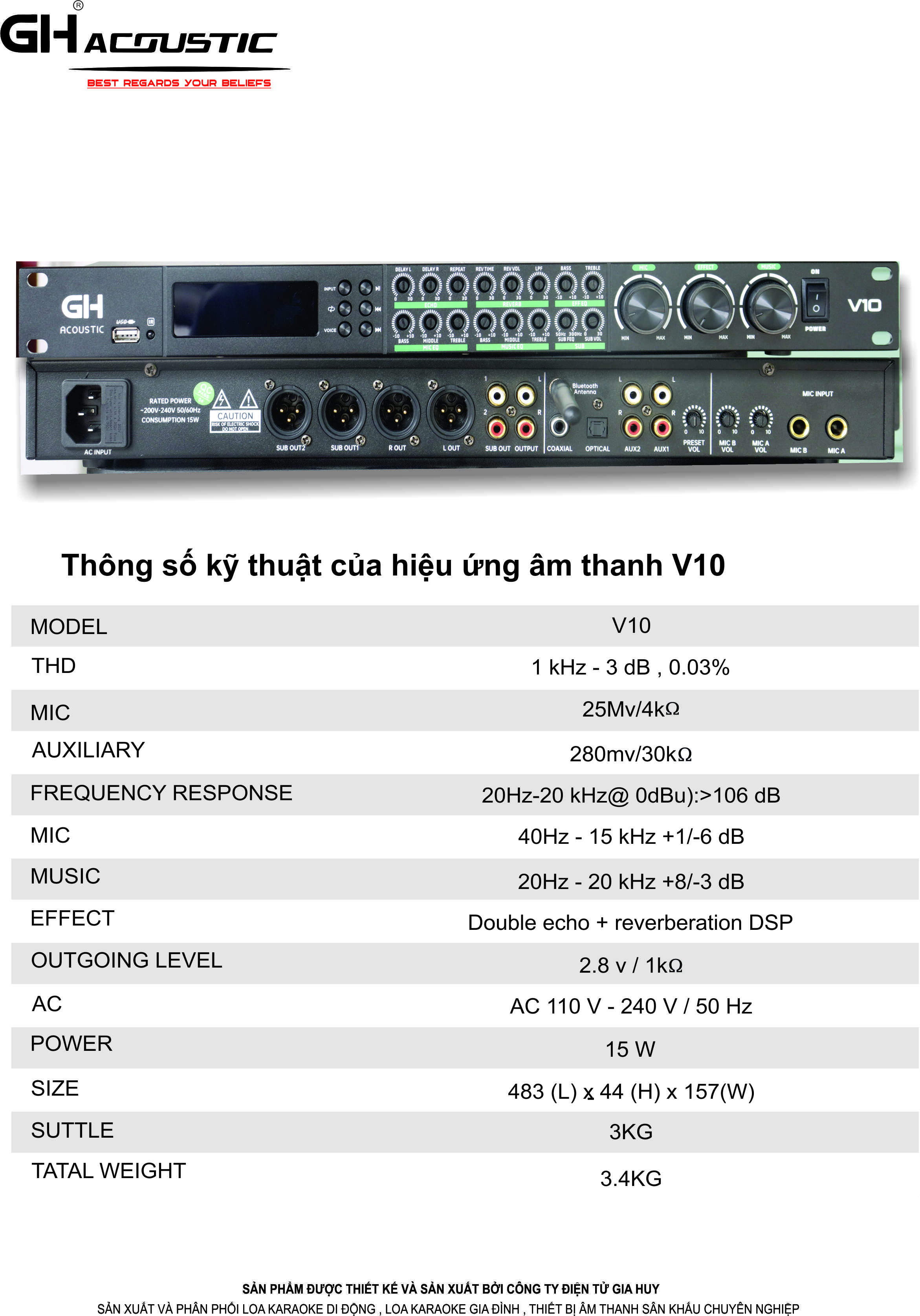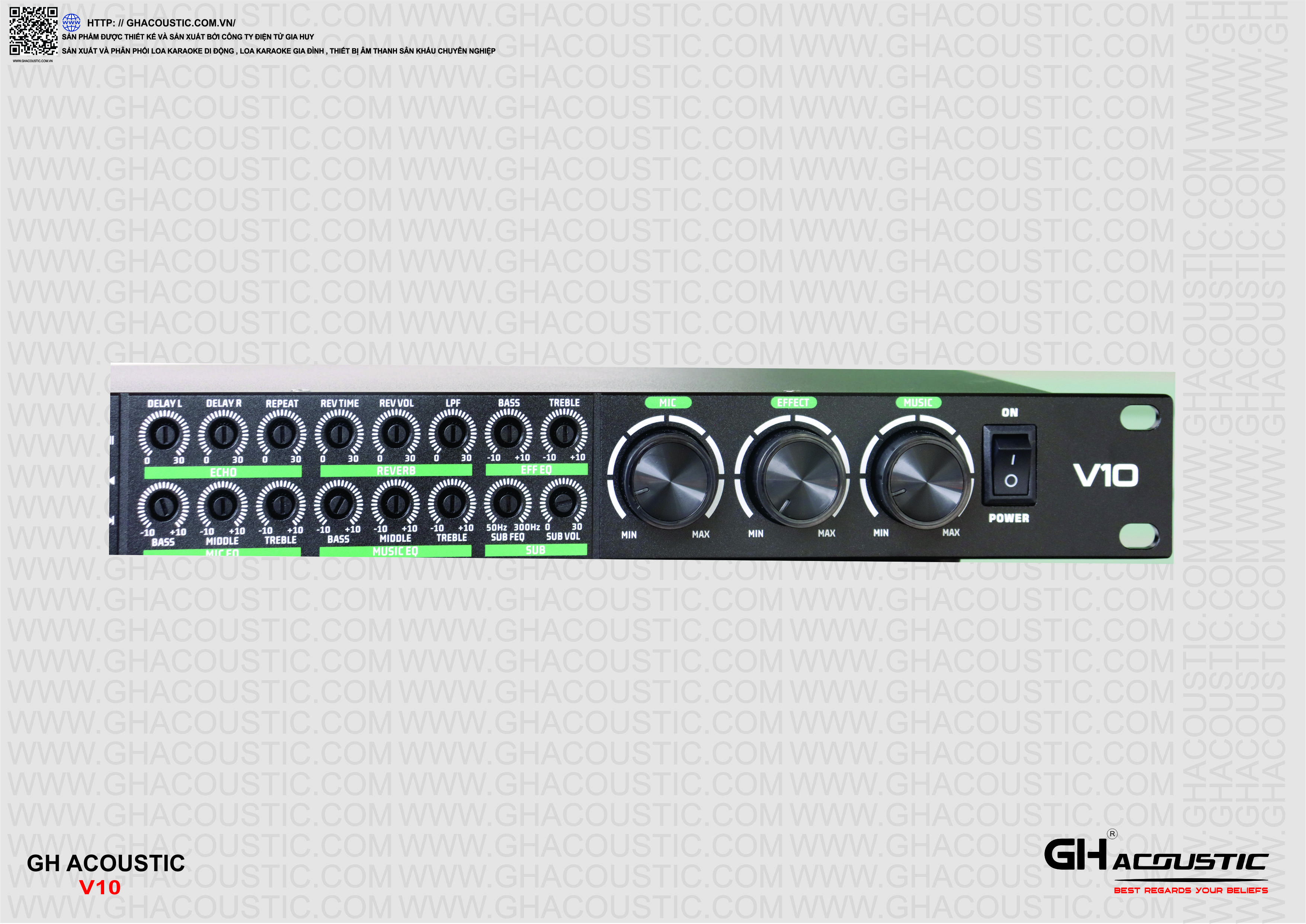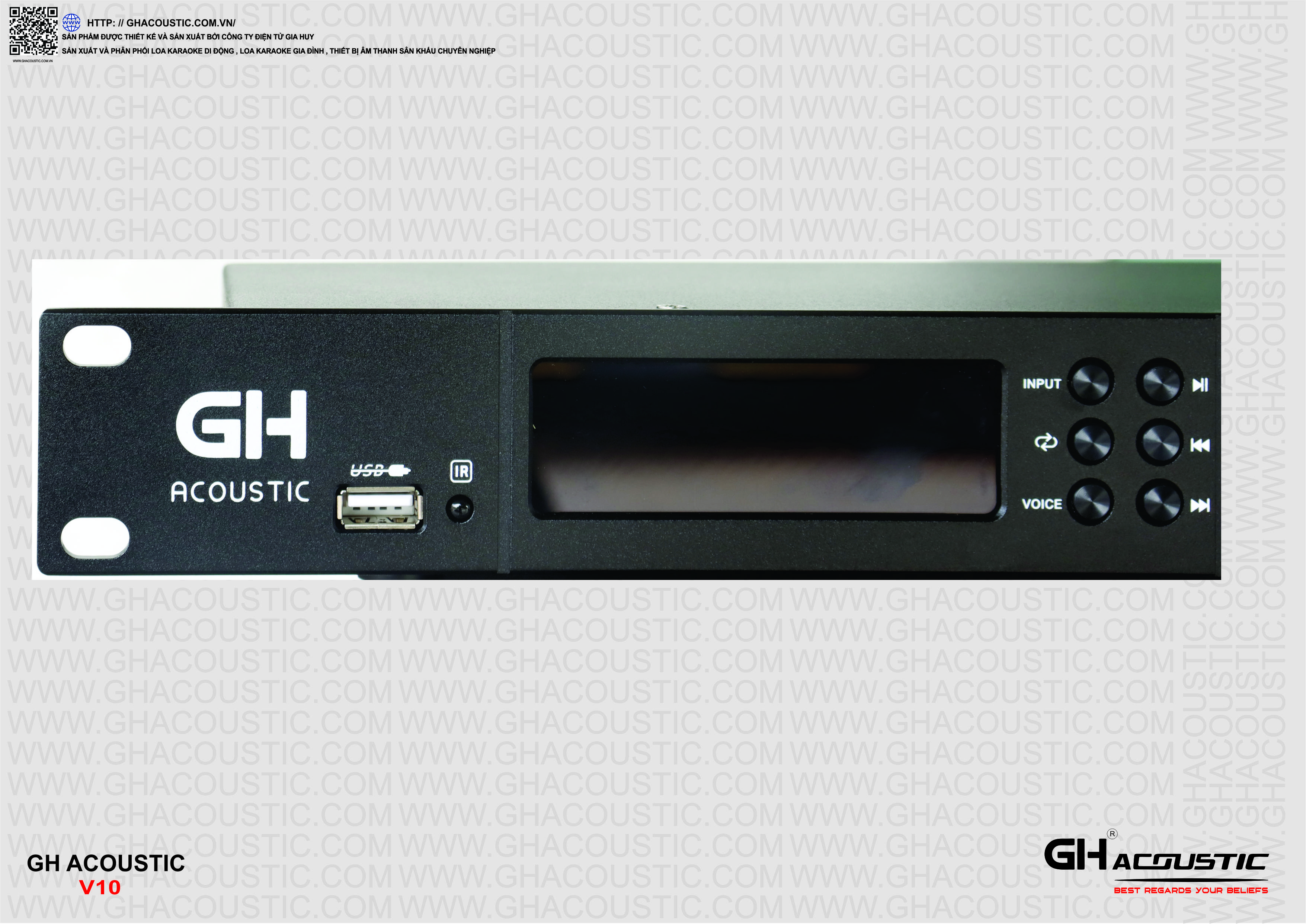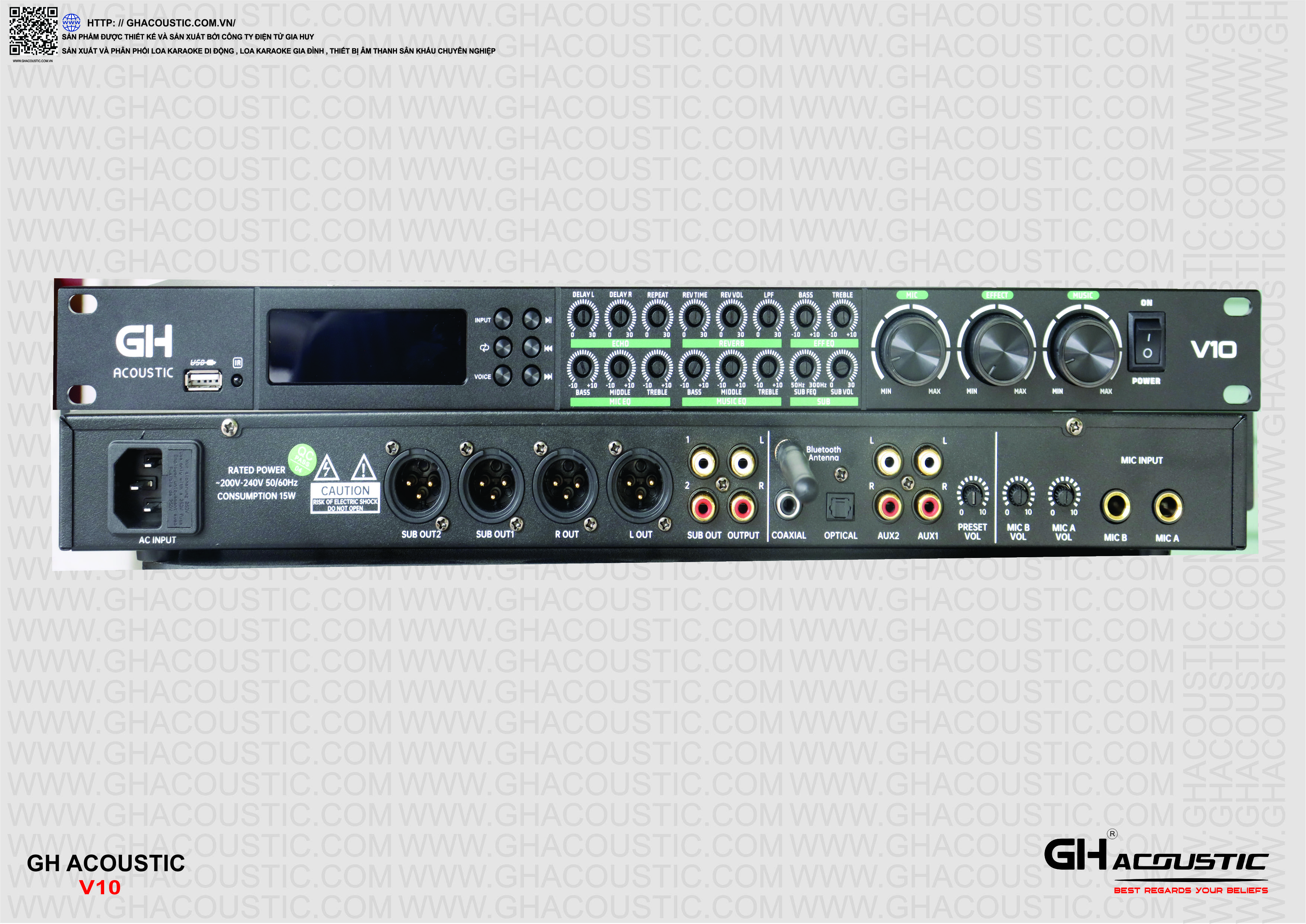 GHacoustic -V10  là phiên bản vang cơ chỉnh tay cao cấp, thiết kế hiện đại, màn hình LCD sắc nét, hiệu ứng Echo – Reverb chuyên nghiệp, chống hú 5 cấp độ và hỗ trợ kết nối Bluetooth – Optical, lý tưởng cho dàn karaoke gia đình hoặc bán chuyên.